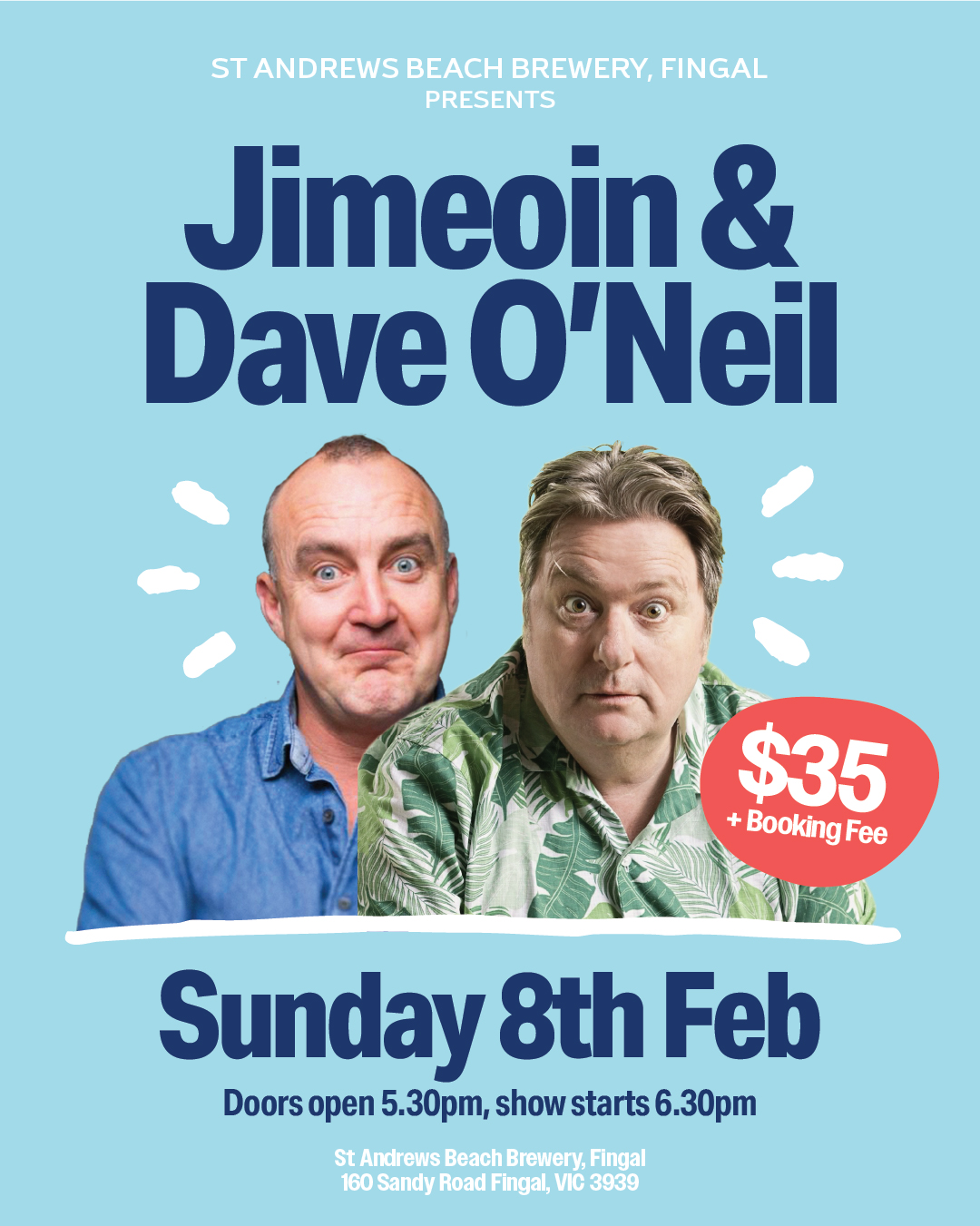 Get ready for a huge night of laughs as comedians Jimeoin and Dave O'Neil take over St Andrews Beach Brewery, Fingal, for one night only. One of Australia’s most loved...